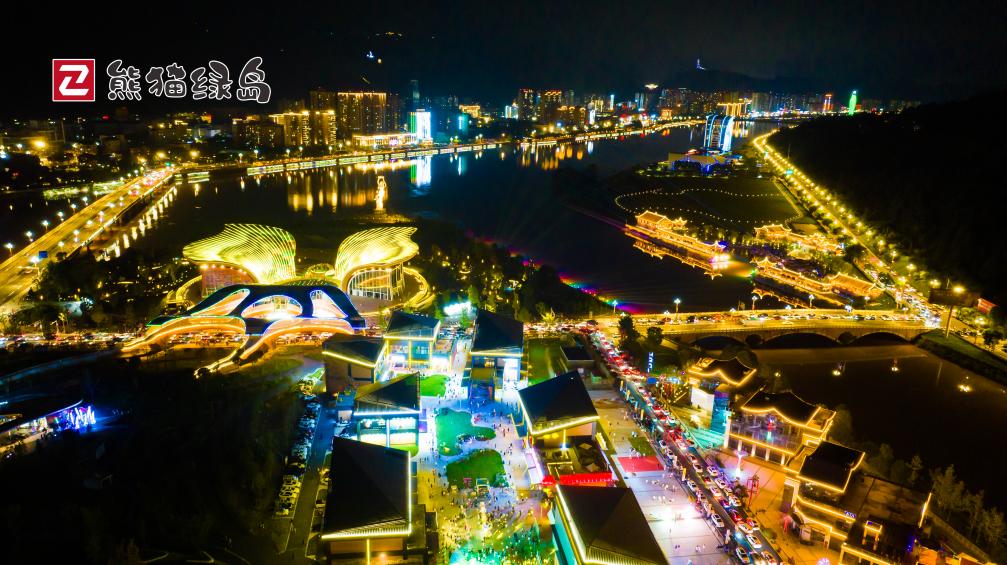 夜幕降臨,熊貓綠島特色文旅消費(fèi)街區(qū)燈火通明。