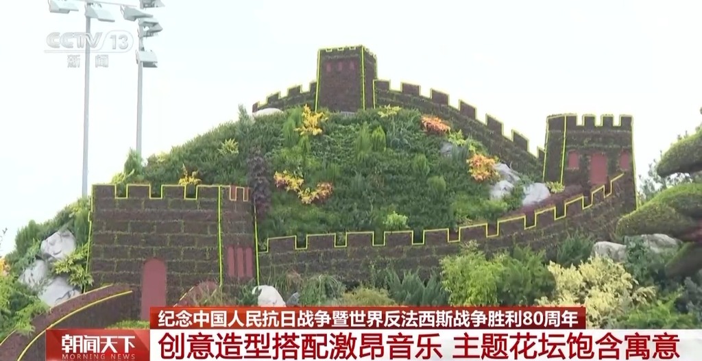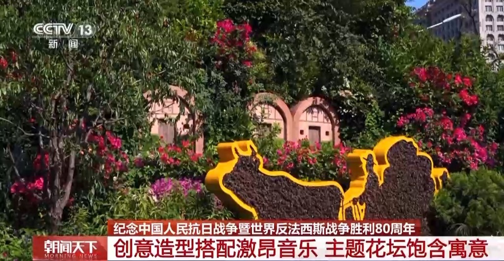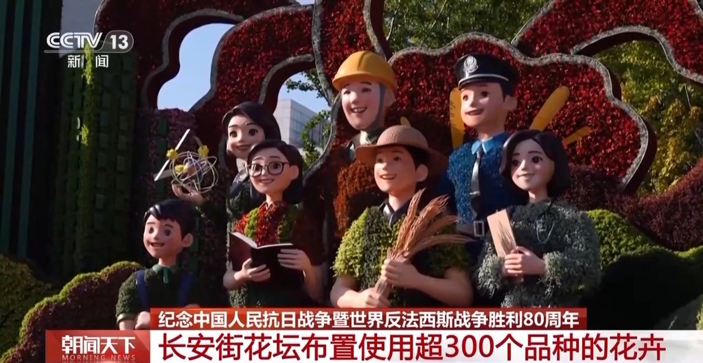 紀(jì)念活動(dòng)期間,北京以“銘記歷史、緬懷先烈、珍愛和平、開創(chuàng)未來(lái)”為主題,在長(zhǎng)安街沿線布置了10組大型立體主題花壇,吸引大批市民游客打卡拍照。
