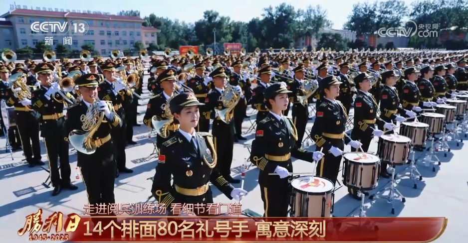 本次聯(lián)合軍樂(lè)團(tuán)在演奏隊(duì)形的編排上,整體設(shè)置了14個(gè)排面,寓意14年抗戰(zhàn);前排設(shè)置了80名禮號(hào)手,寓意抗戰(zhàn)勝利80周年。