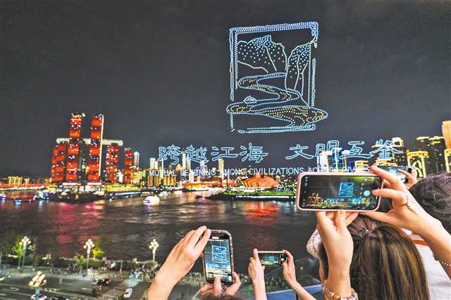 8時(shí)許,第一組無人機(jī)編隊(duì)在夜空定格出“長江文明論壇”LOGO,“跨越江海 文明互鑒”的主題字樣隨之浮現(xiàn),簡潔有力的視覺語言瞬間點(diǎn)明活動核心。緊接著,無人機(jī)化作奔涌的銀色長河,從青藏高原唐古拉山的冰雪意象開始,重慶、武漢、南京等長江流域重要城市依次顯現(xiàn),源遠(yuǎn)流長的壯闊場景讓現(xiàn)場嘉賓紛紛舉起相機(jī)記錄,現(xiàn)場贊嘆聲一片。