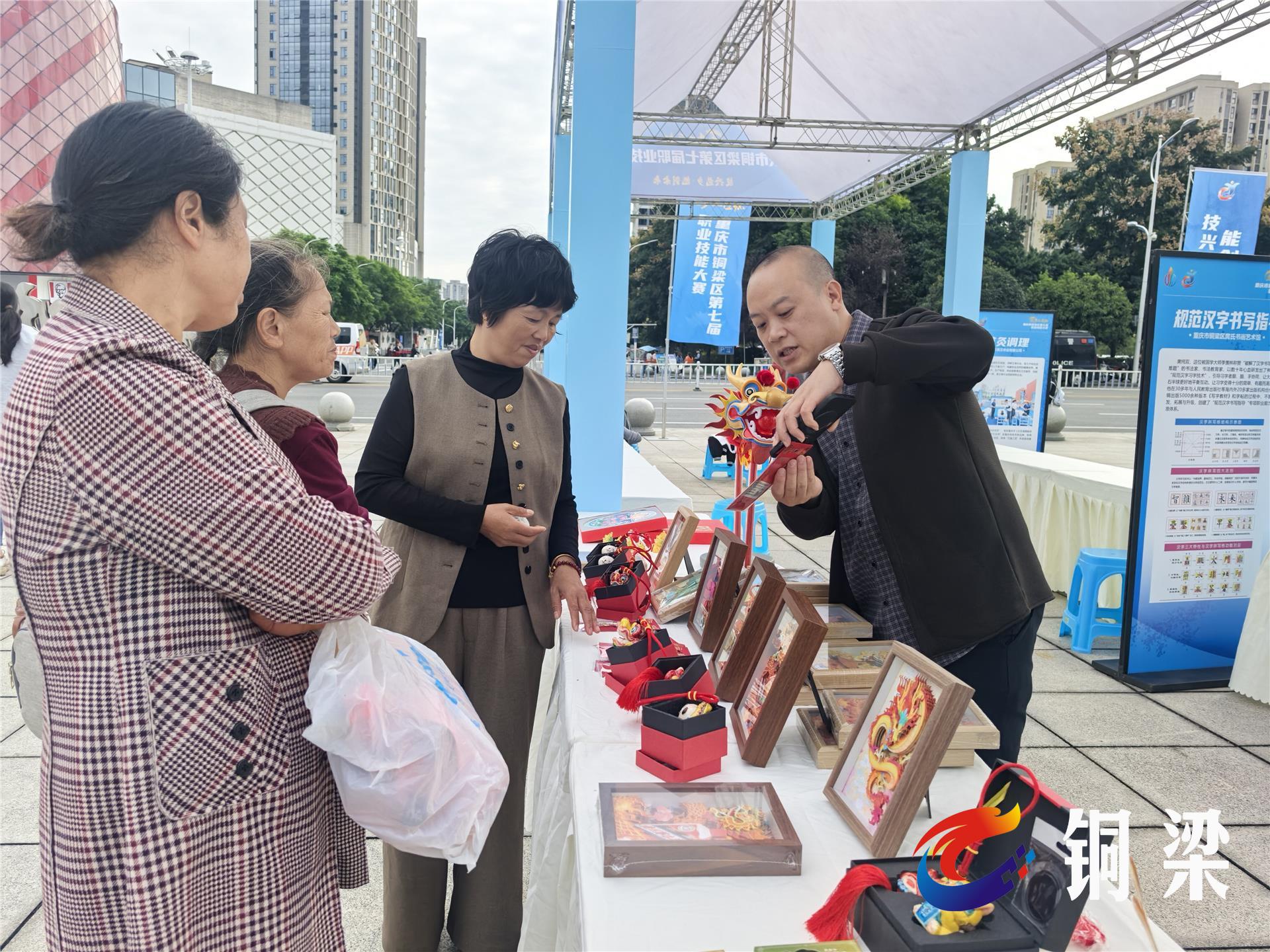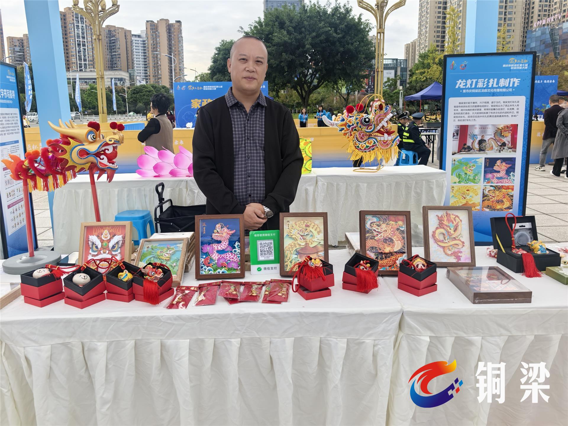 10月22日下午,在銅梁區(qū)第七屆職業(yè)技能比賽現(xiàn)場(chǎng),國(guó)家級(jí)非遺代表性項(xiàng)目銅梁龍燈彩扎第四批區(qū)級(jí)代表性傳承人逯德軍展示了精心創(chuàng)作的小彩龍、工藝龍燈、龍擺件、龍掛件等100多件文創(chuàng)產(chǎn)品。