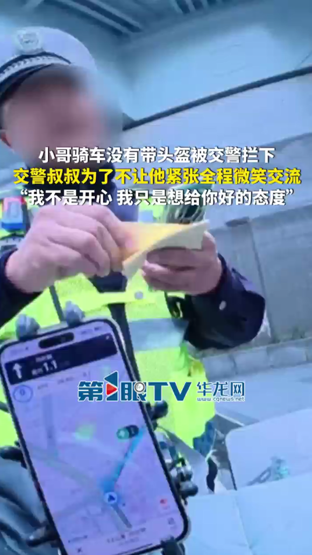小哥騎車沒有帶頭盔被交警攔下,交警叔叔為了不讓他緊張全程微笑交流,“我不是開心,我只是想給你好的態(tài)度”